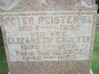 Peter Peister Sr. was born on 10 October 1804 at Sandy Hook, New Jersey, U.S.A; Date 1804 per Memorial. Date Oct 10 1804 & location New York State per Death Reg'n. Date 1805 & location USA per 1881 & 1891 Census. Date 1804 & location Ont. per 1861 & 1871 Census. Date 1804 & location USA per 1851 Census. Location Sandy Hook, New York per Death Reg'n. of son Jacob Peister. (age 87y 27d at Nov 6 1891) Date 1805 per list of householders 1855. Location New York State per Death Reg'n. of son Peter Peister.1,3,4,5,6,7,8,9 He lived before 1827 at Sandy Hook, New Jersey, U.S.A; " ... from Sandy Hook, New Jersey ... " per immigration tag (1827) re report from Peister-Vansicklen Reunion of 1977.10 He immigrated in 1827 to Murray Twp., Northumberland Co., Upper Canada; "Peter Peister arrived at Singleton's Corners (Brighton) from Sandy Hook, New Jersey in 1827. The Van Sicklin family had already been established in the Lawson Settlement since 1804. Peter met and married Elizabeth Crouter who had been living in Singleton's Corners since 1822, when she had arrived from County Cork, Ireland. Peter and Elizabeth bought the north west corner of Lot 28, Concession A, Murray Township and carved a farm from the virgin forest. On that farm they raised seven children, five of whom later married and established their own families in the area. Elizabeth Crouter Peister died at age 63 in 1873. Peter Peister Sr. lived until Nov. 6, 1891." (from a newspaper clipping of the 1977 Peister-Van Sicklin Reunion, copied from The Tweedsmuir Histories of Codrington, Reel 2, Toronto Metro Reference Library, Nov. 2007.)10 He married Elizabeth Coulter, daughter of ? Coulter and ? ?, before 1829 at Northumberland Co., Upper Canada; "I noticed your information on rootsweb regarding Peter Peister. I do know Peter Peister Sr. married Elizabeth Coulter of Brighton Twp. The Coulter's and Peister's farmed as neighbors and worked picking hops on Aaron Coulter's farm. Would you have any other information on Coulters. I'm guessing not as you didn't mention Elizabeths last name. I have been trying to find out more regarding George and Mary Ann Coulter from Brighton as I believe George is a brother to Elizabeth and then would be my grgrgrgrandparents.They would also have a brother Andrew Coulter. I have not had much luck searching information from Brighton area." per email from Susan Pouget, Mar 10 2005. per 1851 Census.11 Peter Peister Sr. lived in 1831 at Conc A Lot 28, Murray Twp., Northumberland Co., Upper Canada; 1831 Assessment & Census: Peter Peister; (no land info); 1 male over 16; 1 male under 16; 1 female over 16; Total 3. He lived in 1832 at Conc A Lot 28, Murray Twp., Northumberland Co., Upper Canada; 1832 Assessment & Census: Peter Peister; 50 acres uncult; Conc A, Lot 28, Rear Half; 1 male over 16; 1 male under 16; 1 female over 16; 1 female under 16; Total 4. He lived in 1833 at Conc A Lot 28, Murray Twp., Northumberland Co., Upper Canada; 1833 Assessment & Census: Peter Peister; 50 acres uncult; Conc A, Lot 28, Rear Half; 1 male over 16; 1 male under 16; 1 female over 16; 1 female under 16; Total 4. He lived in 1835 at Conc A Lot 28, Murray Twp., Northumberland Co., Upper Canada; 1835 Assessment & Census: ??? Peter Peister is not in 1835 Assessment & Census
