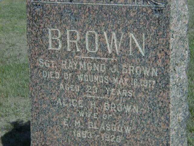 "Brown: Died of wounds, in Infirmary Pavilion, Southport, Eng., on May 18, 1917, Raymond James Brown, second son of Mr. and Mrs. S. J. Brown. Memorial services will be held in the Edville Methodist church on Sunday afternoon, June 3rd, at 2.30 o'clock." from pg. 053 of Newspaper Clippings, a collection donated by Shawnee Spencer to the Brighton Digital Archives, 2022.4,7,8 He was buried on 20 May 1917 at Salem Cemetery, Cramahe Twp., Salem, Northumberland Co., Ontario; Memorial: (See Exhibit) BROWN; Sgt. Raymond J. Brown; Died of Wounds May 18, 1917; Aged 23 Years; Alice H. Brown; Wife of E. M. Glasgow; 1893 - 1928 (Salem Cemetery, Cramahe Twp.)