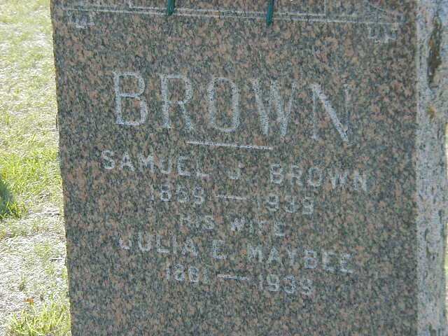 Samuel James Brown was born on 12 July 1859 at West Qwillimbury Twp., Bradford, Simcoe Co., Canada West; Date 1859 per Memorial. Date 1860 & location Ont. per 1921 Census. Date July 1862 & location Ont. per 1911 Census. Date Jul 12 1859 & location Ontario per 1901 Census. Date 1859 & location CW per 1861 Census. Date 1861 & location Cda. per marr. reg'n. Location Bradford, Ont. per marr. reg'n of his son Robert Henry Brown.1,2,7,3,8,5 He appeared on the census of April 1861 at Peel Twp., Wellington Co., Canada West; Age 2 at 1861 Census: see James Sheppard (grandfather.)7 He lived on 6 November 1887 at Essa Twp., Simcoe Co., Ontario; Residence Essa, Ont. per marriage reg'n.2 He married Julia Emmaline Maybee, daughter of Robert Brazila Maybee and Mary Ann Fairman, on 6 November 1887 at Trenton, Hastings Co., Ontario; Marriage Reg'n.#004711: Groom: S. J. Brown; Age: 26; Res.: Essa, Ont; Born: Cda; Status: bachelor; Occ.: farmer; Parents: George A. & J. Brown; Bride: Julia E. Maybee; Age: 24; Res; Frankford; Born: Cda; Status: spinster; Parents: R. & M. A. Maybee; Wit.: Annie Allen, Trenton; Date: Nov 6 1887?; Place: Trenton; Rel.: Meth; Performed by: H. J. Allen; Reg'r.: A. G. Whittier (Ontario Marriage Registration, #004711-1887, ancestry.ca) Date Mov 7 1887 per IGI Record. per 1901 Census.9,10 Samuel James Brown lived in 1891 at Ontario; Two children, Royden & Alice, shown to be born in N.D. and immigrated to Cda. 1891 - per 1901 Census.1 He appeared on the census of April 1901 at Brighton Twp., East Northumberland Co., Ontario; Age 41 at 1901 Census: Brown, Samuel J., b. Ont. Jul 12 1859, English, Meth., farm lab., married; Julia E., 39, b. Ont. May 3 1861, Dutch, Ce, married; Royden S., 11, b. N.D. Jul 21 1889, Immig. 1891, son, Meth; Alice, 10, b. N.D. Mar 6 1890, daughter; George A., 8, b. Ont. Jul 15 1894, son; Robert, 4, b. Ont. Sep 19 1896, son (1901 Census: Brighotn Twp., East Northumberland Co., dist. 95, sub-dist. a-1, pg. 3, line 26 - ancestry.ca.)1 He lived in April 1901 at Conc 3 Lot 5, Brighton Twp., Northumberland Co., Ontario; Residence per 1901 Census: Conc 3, Lot 5.1 He lived in 1911 at Conc 7 Lot 13, Cramahe Twp., Nortbumberland Co., Ontario; Location of Samuel J. Brown in 1911, Conc 7, Lot 13, Cramahe Twp. which is just west of the Goodrich-Loomis Conservation Area.3 He appeared on the census of 1911 at Cramahe Twp., East Northumberland Co., Ontario; Age 48 at 1911 Census: Brown, Samuel J., 48, b. Ont. July 1862, Eng., Meth., farmer, married; Julie E., 45, b. Ont. May 1866, Eng., Meth., married; Roy S., 21, b. USA Feb 1890?, Eng., Meth., son, farmer, single; Ray J., 18, b. Ont. May 1893, son; George A., 16, b. Ont. July 1894, son; Robert, 14, b. Ont. Sep 1896, son; Alice(f), 20, b. USA, Mar 1891, dau; Ada, 9. b. Ont. Jul 1901, dau. (1911 Census: Cramahe Twp., East Northumberland Co., dist. 101-7, pg. 10 of 11, line 39 - Conc 7, Lot 13, Cramahe Twp. - ancestry.ca.)3 He appeared on the census of 14 June 1921 at Cramahe Twp., Northumberland Co., Ontario; Age 61 at 1921 Census: Brown, Samuel, 61, b. Ont., p.b. Ont. & Eng., Eng., Meth., farmer, married; Julian, 59, b. Ont., p.b. Ont., Eng., Meth., married; George, 25, b. Ont., p.b. Ont., Eng., Meth., farmer, single; Robert, 22, b. Ont, p.b. Ont., Eng., Meth., farmer, single; Addie, 19 (1921 Census: Cramae Twp., Northumberland Co., dist. 107, sub-dist. 8, pg. 8, line 38 - ancestry.ca.)5 He died on 24 March 1939 at Ontario at age 79; Date 1939 per Memorial. Date Mar 24 1939 & "of Grafton" per family tree of six6sixkinds on ancestry.ca, June 27 2018.8,4 He was buried on 27 March 1939 at Salem Cemetery, Cramahe Twp., Salem, Northumberland Co., Ontario; Memorial: (See Exhibit) BROWN; Samuel J. Brown; 1859 - 1939; His Wife; Julia E. Maybee; 1866 - 1939 (Salem Cemetery, Cramahe Twp.)8
