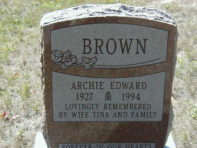Archie Edward Brown was born on 21 March 1927; Date 1927 per Memorial. Date Mar 21 1927 per family tree of brucesparks1 on ancestry.com, Jan 31 2016. per GEDCOM of C. Penasack, June 16, 2005.1,2,3 He died on 7 January 1994 at Colborne, Northumberland Co., Ontario, at age 66; Date 1994 per Memorial. Date Jan 7 1994 & location Colborne per family tree of brucesparks1 on ancestry.com, Jan 31 2016.2,3 He was buried on 9 January 1994 at Salem Cemetery, Cramahe Twp., Salem, Northumberland Co., Ontario; Memorial: (See Exhibit) BROWN; Archie Edward; 1927 - 1994; Lovingly Remembered; By Wife Tina and Family (Salem Cemetery, Cramahe Twp., Jul 10 2004.)3