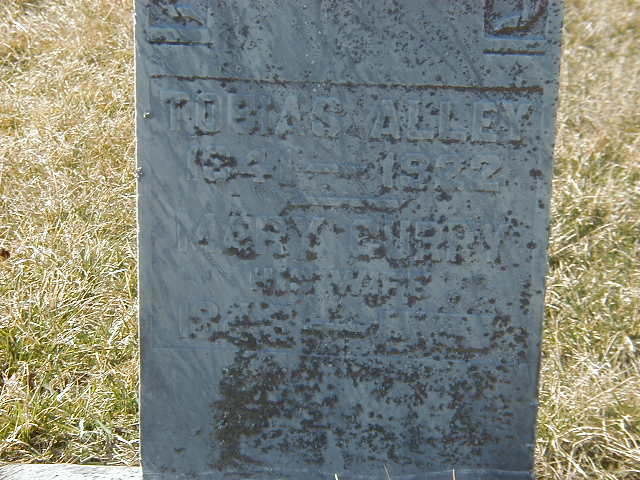 Note: Parents of Tobias Alley disagree with Marriage Registration which shows James & Rebecca Alley. It appears that James is right sincce Tobias is with James and Rebecca in 1861 Census. Date 1922 per Burial. per GEDCOM of Susan Brenner, Apr 19, 2006.2,8,11,3 He was buried on 7 June 1922 at Wooler Friends Cemetery, Brighton Twp., Northumberland Co., Ontario; Memorial: (See Exhibit) Tobias Alley; 1841 - 1922; His Wife; Mary Curry; 1846 - ? (Wooler Friends Cemetery, Brighton Twp., Apr 2 2006) per Death Reg'n.8,4