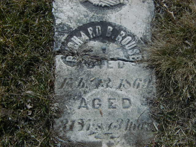 CemSearch: Name: Richard Bernard Rouse; Born: Dec 1837; Died: Feb 13 1869; Age: 31y 3m; ID: WOODS187; No other names; Cemetery: Woods Cemetery, Conc 1, Lot 12, Cramahe Twp., Northumberland Co., Sec S Row 8 Plot 2; Note: Cement marker - R.R. (https://www.cemsearch.ca/burial/?pid=WOODS187%5E0.)2,3