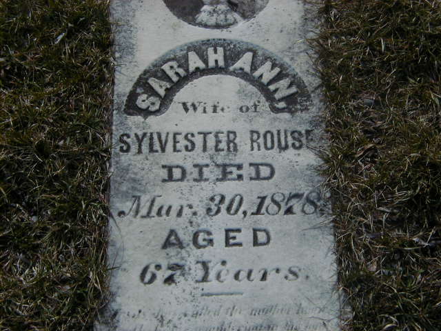 FindaGrave: Name: Sarah Ann Rouse; BIRTH: 1811, USA; DEATH: 30 Mar 1878 (aged 66–67), Brighton, Northumberland County, Ontario, Canada; BURIAL: Non-Cemetery Burial, Specifically: Woods Cemetery, Cramahe Twp; MEMORIAL ID: 58739170 (https://www.findagrave.com/memorial/58739170/sarah-ann-rouse.)2,7