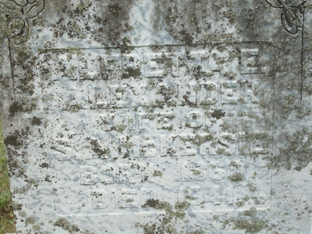 CemSearch: Name: Alfretta e. McKersie; Maiden: Alexander; Born: 1860; Died: 1941; ID: WOODS149; No other names; Cemetery: Woods Cemetery, Conc 1, Lot 12, Cramahe Twp., Northumberland Co., Sec S Row 10 Plot 1; Note: Wife of S. A. McKersie (https://www.cemsearch.ca/burial/?pid=WOODS149%5E0) Date Jun 30 1941 & location Woods Cemetery per Death Reg'n.4,5,6