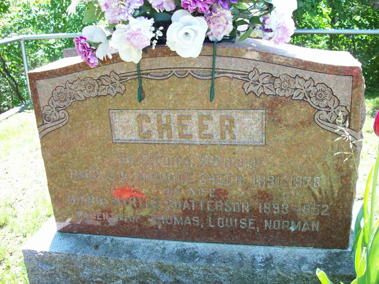 Harold Reginald "Maurice" Cheer was born on 6 June 1891 at 43 Esther St., Toronto, York Co., Ontario; Birth Reg'n.#003110: Name: Jun 6 1891; Parents: Harold Reginald Maurice Cheer; Parents: Charles Cheer & Alice Towersey; Inf.: Charles Cheer, Theatrical B.. Mgr., 43 Esther St., Toronto; Reg'd.: Jun 22 1891; Phys.: Dr. Shatby?; Reg'r.: John Blevins (Ontario Birth Registration, #003110-1891, ancestry.com) Date 1891 per Memorial. Date Jun 6 1891 & location Ontario per 1901 Census. Date 1892 & location Toronto per marr. reg'n. Date 1891 per "The George Chatterson Family", copied from original provided by Florence Chatten, June 4, 2005. Date June 1891 per 1911 Census.3,4,5,6,7 He appeared on the census of April 1901 at Brighton, Northumberland Co., Ontario; Age 9 at 1901 Census: see Charles Cheer.3 He appeared on the census of 1 June 1911 at Brighton Twp., Smithfield, Northumberland Co., Ontario; Age 19 at 1911 Census: see Samuel Cheer.4 He lived on 8 March 1916 at Brighton Twp., Northumberland Co., Ontario; Residence Brighton per marr. reg'n.6 He married Minnie Myrtle Chatterson, daughter of Shuter "Smith" Chatterson and Sarah Maria O'Reilly, on 8 March 1916 at Frankford, Hastings Co., Ontario; Marriafge Reg'n.#010730: Groom: Harold Reginald Maurice Cheer; Age: 24; Res.: Brighton; Born: Toronto; Status: bachelor; Occ.: Electrician; Rel.: Pres; Parents: Charles Cheer & Alice Towersly; Bride: Minnie Myrtle Chatterson; Age: 22; Res.: Brighton; Born: Cramahe; Status: spinster; Rel.: Meth; Parents: Shuter Chatterson & Maria O'Reilly; Wit.: Mrs. S. W. & Lela Meyers, Frankford; Date: Mar 8 1916; Place: Frankford; Performed by: D. P. Knox, Frankford, Meth; Sworn: Frankford, Mar 8 1916; Reg'r.: Michael Sarles (Ontario Marriage Registration, #010730-1916, ancestry.com) "Chatterson, Myrtle; Marrie March 8, 1916 to Maurice Cheer; March 24, 1916" from The Brighton Ensign, Mar 24, 1916, The Trenton Public Library, June 5, 2005. per "The George Chatterson Family", copied from original provided by Florence Chatten, June 4, 2005.8,9 Harold Reginald "Maurice" Cheer lived on 13 March 1926 at Village Lot 28, Main St. South, Brighton, Northumberland Co., Ontario; Land Registry Records (Grant 6139) show that Peter S. Ewing, James B. Frost (executors), Mary E. White, Clara L. Ewing (spinster) , Helen J. Ewing (spinseter,James B. Frost, George A. Frost sold Village Lot 28, Main St. South Side, Brighton Village, Northumberland Co. to Harold R.M. Cheer for $2,100. ITS Date: Mar 13 1926. Reg'n. Date: Apr 3 1926. (Ontario Land Registry Records, Northumberland Co., Brighton Village, Book 004, pg. 135 of 399, (Conc 1, Lot 2, Brighton Twp.), page copied from OnLand.ca by Dan Buchanan, Apr 5 2023.)10 He "Cheer Family, the Old Opera House and Their Part in Brighton History By Rose Ellery: Samuel Charles Cheer was born in Brighton in 1863, married Alice Maddox Towersey and toured the vaudeville circuit of New York State and Ontario for many years, then decided to settle in Brighton to raise a family. Their three children were born here and during this period, Samuel and Alice both performed regularly at the "Old Opera House" on the second floor of Brighton's Town Hall. The hall was built in 1885 and demolished by a tornado on July 13th, 1973. Their daughter Ruby (1904) performed in these plays right from when she was a young girl. Maurice Cheer (1891) also performed and got the nickname "Rube" from one of the characters he portrayed. Mr. Cheer also directed many of the plays performed at this time and Alice, a gifted singer, was also pianist for other acts and performances at the Opera House. Sam Cheer was bailiff and mail courier in the '20s and '30s. Their son Ralph (1893) was nicknamed Dan from a performance. As a young man, he operated an ice cream parlour in the Proctor Block, on the easterly north side of Main Street. This is now the brick wall just west of the restored facade of the old Standard and CIBC bank, and is part of the Sobeys parking lot. This block, after many renovations over the years, was destroyed by fire in 1980. Ralph was also employed by Grant Quick at Presqu'ile Pavilion in the 1920s and again in the late 1940s. During this period he also owned a farm east of the present public school at Spring Valley on County Road 26. The family lived there until they "moved to town" in 1948. Their farm was purchased by Peter and Jessie Kulaska, newly arrived from Europe and is now owned by Peter and Jessie's one daughter, Lucille and son-in-law, Tom Coyne, who are chicken producers. Maurice Cheer, an electrician by trade, worked locally; he rewired the Cooey plant at one time and was employed at General Motors as an electrical maintenance man. He later worked at the Trenton Air Base in the same capacity until his retirement. He then did the odd wiring job for individuals for a few years. Maurice loved horse racing and had attended every Queen's Plate running for as long as his health would allow. Many a horse calendar adorned the walls of his home. He never owned a horse, just enjoyed them." "That's Just The Way We Were, Brighton Memories", pg. 256 & 257 circa 1930 at Brighton, Northumberland Co., Ontario.11 He lived in 1935 at Brighton, Northumberland Co., Ontario; "73 Cheer, Maurice, electrician, Brighton" & "74 Cheer, Mrs. Maurice, married woman, Brighton" Canada Voters List, 1935, Northumberland County, Brighton, pg. 17 of 126 - ancestry.com.12 He lived in 1940 at Brighton, Northumberland Co., Ontario; "24 Cheer, Maurice, electrician, Brighton" & "25 Cheer, Mrs. Maurice, Brighton" Canada Voters List, 1940, Northumberland County, Brighton, pg. 8 of 118 - ancestry.com.12 He lived in 1945 at Brighton, Northumberland Co., Ontario; "25 Cheer, Maurice, electrician, Brighton" & 26 Cheer, Mrs. Maurice, Brighton" Canada Voters List, 1935-1980, Northumberland County, Brighton, pg. 43 of 147 - ancestry.com.12 He lived on 12 December 1952 at Village Lot 28, Main St. South, Brighton, Northumberland Co., Ontario; Land Regi