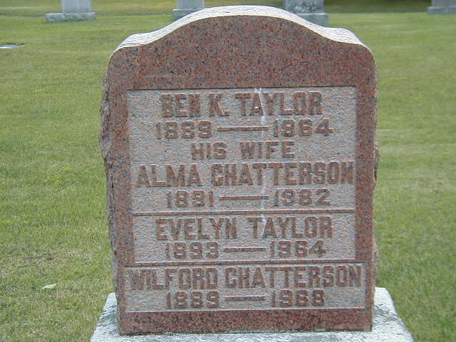 CEMSearch: Name: Wilford Chatterson; Born: 1889; Died: 1968; Buried: Fairlview Cemetery, Haldimand Twp., SEc West Plot 103; Other names: Almae Euretta Taylor (Chatterson)(1891-1982), Amanda M. Taylor (Maybee)(1855-1941), Ben K. Taylor (1889-1964), Charles E. Taylor (1850-1922), Evelyn Taylor (1893-1964), Hilda Jean Taylor (1918-1926), Pautline Ruth (Wiggy) Taylor.4,2