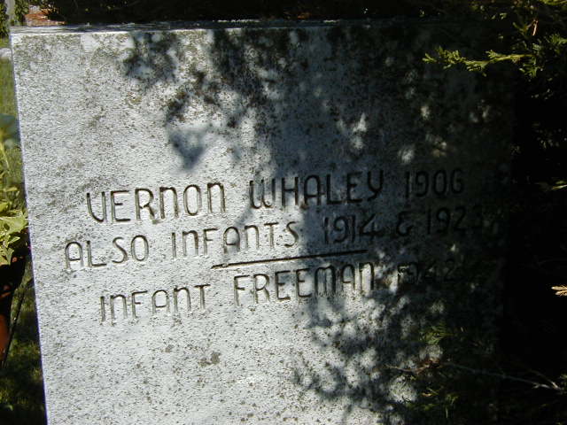 Vernon Whaley was born in 1906 at Ontario; Date 1906 per Burial.1 He was buried circa 1910 at Carman Cemetery, Brighton Twp., Carman, Northumberland Co., Ontario; Memorial: (See Exhbit) Vermon Whaley 1906 ...; Also Infants 1914 & 1920?; Infanct Freeman ??? (Carman Cemetery, Brighton Twp., June 26, 2005.)1 He died circa 1910 at Ontario; Date unclear per picture of stone??1