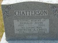 Donald John Chatterson was born on 18 September 1920 at Cramahe Twp., Northumberland Co., Ontario; "Chatterson; A son born September 18, 1920 to Mrs. Robert; September 24, 1920" from The Brighton Ensign Index, Sep 24, 1920, The Trenton Public Library, June 5, 2005. Date Nov 1920 & location Ont. per 1921 Census - age 8 months at 1921 Census Jun 14 1921. Date 1920 per "Chatterson, Peters, Trenear, Hicks, Dowsett Tree" sent to me May 22 2013 by Hall Hicks.1,2,3 He appeared on the census of 14 June 1921 at Cramahe Twp., Northumberland Co., Ontario; Age 8 months at 1921 Census: see Robert Chatterson.3 He married Gertrude A. Cross circa 1960; per Memorial.4 Donald John Chatterson died in 2002; Date 2002 per Memorial. per "Chatterson, Peters, Trenear, Hicks, Dowsett Tree" sent to me May 22 2013 by Hall Hicks.2,4 He was buried in 2002 at Salem Cemetery, Cramahe Twp., Salem, Northumberland Co., Ontario; Memorial: (See Exhibit) CHATTERSON; In Loving Memory of; Donald John; 1920 - 2002; His Loving Wife; Gertrude A. Cross; 1924 - 2004 (Salem Cemetery, Cramahe Twp., Jun 5 2005.)4