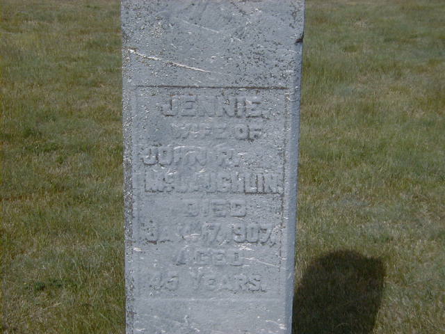 Jennie ? was born in 1862; Date 1862 per Burial.1 As of circa 1884,her married name was McLaughlin.1 She married John R. McLaughlin, son of James McLaughlin and Phoebe Ann Maybee, circa 1884 at Ontario; per Burial of wife Jennie.1 Jennie ? died on 17 January 1907 at Ontario; Date Jan 17 1907 per Burial.1 She was buried on 19 January 1907 at McPhail's Cemetery, Brighotn Twp., Northumberland Co., Ontario; Memorial: (See Exhibit) Jennie; wife of; John R; McLaughlin; Died; Jan 17, 1907; Aged; 45 Years (McPhail's Cemetery, Brighton Twp., June 4, 2005.)1
