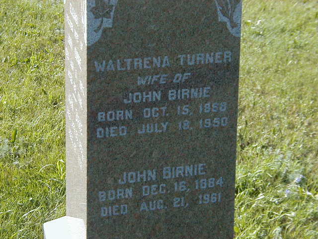 John Birnie was born on 16 December 1884 at Manitoba; Date Dec 16 1884 & location Manitoba per 1901 Census.1 He appeared on the census of 11 April 1901 at Rosedale District, Macdonald, Manitoba; Age 16 at 1901 Census: see John Birnie.1 He appeared on the census of 10 July 1906 at Sub-district 9a, Dauphin District, Manitoba; Age 19 at 1906 Census: see John Birnie.2 He married Waltrena Turner after 1910 at Manitoba; per GEDCOM of Patricia Profit, July 18, 2005.3 John Birnie died on 21 August 1961 at Manitoba at age 76; Date Aug 21 1961 per Memorial.4 He was buried on 23 August 1961 at Birnie Cemetery, Birnie, Manitoba; Memorial: (See Exhibit) Waltrena Turner; Wife of; John Birnie; Born Oct 15 1888; Died Jul 18 1950; John Birnie; Born Dec 16 1884; Died Aug 21, 1961 (Birnie Cemetery, Birnie, Manitoba, July 14, 2005.)4