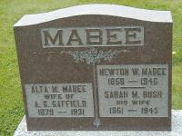 Newton Wesley Mabee was born on 7 April 1858 at Ameliasburgh Twp., Prince Edward Co., Ontario; per GEDCOM of John Maybee, July 24, 2005.1 He married Sarah Annette Vermilyea on 13 November 1878 at Murray Twp., Northumberland Co., Ontario; per GEDCOM of John Maybee, July 24, 2005. Newton Wesley Mabee married Sarah Matilda Bush on 26 June 1884 at Sidney Twp., Hastings Co., Ontario; per GEDCOM of John Maybee, July 24, 2005.1 Newton Wesley Mabee died on 10 February 1946 at Peterborough, Ontario, at age 87; per GEDCOM of John Maybee, July 24, 2005.1 He was buried on 12 February 1946 at Frankford Cemetery, Frankford, Hastings Co., Ontario; Memorial: (See Exhibit) MABEE; Alta M. Mabee; Wife of; A. G. Gaffield; 1879 - 1931; Newton W. Mabee; 1858 - 1946; Sarah M. Bush; His Wife; 1861 - 1945 (Frankford Cemetery, May 22, 2005.)2