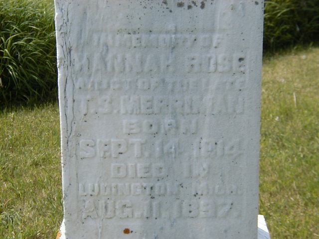Hannah Rose was born on 14 September 1814 at Ontario; Date 1812 & location Cda. per 1851 Census. Date Sep 14 1814 per Burial.1,2 As of before 1833,her married name was Merriman.1 She married Titus S. Merriman, son of Joel Merriman and Anna Perkins, before 1833 at Northumberland Co., Upper Canada; per 1851 Census. per Burial.1,2 Hannah Rose appeared on the census of 1851 at Cramahe Twp., Northumberland Co., Ontario; Age 39 at 1851 Census: see Titus S. Merriman.2 She died on 11 August 1897 at Ludington, Michigan, U.S.A., at age 82; Date Aug 11 1897 & location Ludington, Mich. per Burial.1 She was buried on 18 August 1897 at East Colborne Cemetery, Colborne, Northumberland Co., Ontario; Memorial: (See Exhibit) In Memory of; Hannah Rose; Wife of the Late; T. S. Merriman; Born; Sep 14 1814; Died In; Ludington, Mich; Aug. 11, 1897 (East Colborne Cemetery, Colborne, June 5, 2005.)1