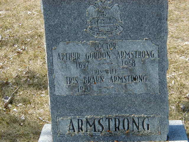 Date Jun 1897 per 1911 Census.1,4 He appeared on the census of 1 June 1911 at Brighton Twp., Codrington, Northumberland Co., Ontario; Age 14 at 1911 Census: see James Armstrong.1 He lived on 2 November 1921 at Alnwick Twp., Northumberland Co., Ontario; Residence Alnwick per marr. reg'n.5 He married Adeline T. Knox, daughter of John A. Knox and Harriet E. Turnbull, on 2 November 1921 at Toronto, York Co., Ontario; Marriage Reg'n.#006451: Groom: Arthur G. Armstrong; Age: 24; Res.: Alnwick Twp; Born: Brighton Twp; Status: bachelor; Occ.: Physician; Rel.: Pres; Parents: James A. Armstrong & Effie J. Black; Expected Res.: Toronto; Bride: Adeline T. Knox; Age: 24; Res.: 71 Spadina Rd., Toronto; Born: Toronto; Status: spinster; Occ.: nurse; Rel.: Sw...ian?; Parents: John A. Knox and Harriet E. Turnbull; Date: Nov 2 1921; Place: Toronto; Peformed by: Herbert C. Small; Sworn: Toronto, Oct 4 1921 (Ontario Marriage Registration, #006451-1921, ancestry.com.)6 Arthur Gordon Armstrong was buried in 1968 at Warkworth Cemetery, Warkworth, Northumberland Co., Ontario; Memorial: (See Exhibit) Doctor; Arthur Gordon Armstrong; 1897 - 1968; His Wife; Iris Braun Armstrong; 1920 - (Warkworth Cemetery, Warkworth, Apr. 28, 2007.)2 He died in 1968; Date 1968 per Memorial.2