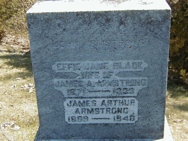 Effie Jane Black was born in October 1873 at Ontario; Date Oct 1873 per 1911 Census. Date 1871 per Memorial.1,3 As of before 1893,her married name was Armstrong.1 She married James Arthur Armstrong, son of John Armstrong and Sarah Elizabeth Arthur, before 1893 at Northumberland Co., Ontario; per 1911 Census.1 Effie Jane Black appeared on the census of 1 June 1911 at Brighton Twp., Codrington, Northumberland Co., Ontario; Age 38 at 1911 Census: see James Armstrong.1 She was buried in 1933 at Warkworth Cemetery, Warkworth, Northumberland Co., Ontario; Memorial: (See Exhibit) John Amrstrong; 1841 - 1917; Effie Jane Black; Wife of ; James A. Armstrong; 1871 - 1933; James Arthur Armstrong; 1869 - 1948 (Warkworth Cemetery, Warkworth, Apr. 28, 2007.)3 She died in 1933; Date 1933 per Memorial.3
