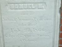 Samuel H. Pearson was born on 7 May 1837 at Ontario; Date May 7 1837 per Memorial - age 28y 9m 15d at death Feb 22 1866. Date 1837 per 1861 Census. Date 1838 per GEDCOM of John Maybee, Aug 3, 2005.1,2,3 He appeared on the census of April 1861 at Brighton Twp., Northumberland Co., Ontario; Age 24 at 1861 Census: see John Pearson.2 He died on 22 February 1866 at Ontario at age 28; Date Feb 22 1866 per Memorial.3 He was buried on 24 February 1866 at Wooler Friends Cemetery, Brighton Twp., Northumberland Co., Ontario; Memorial: (See Exhibit) Samuel H; son of; John & Jemima Pearson; who died; Feb. 22, 1866; aged 28 yrs. 9 mos; & 15 days (Wooler Friends Cemetery, Brighton Twp., June 30, 2008.)3