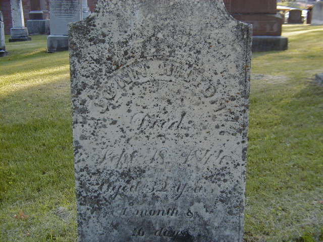 John Hilton was born on 2 August 1812; Date Aug 2 1812 per calc from Memorial - age 32y 1?m 16d at death Sep 18 1844?. per Pioneer Life on the Bay of Quinte, pg. 97.1,2 He married Matilda Ashley, daughter of Simeon Ashley and Mary Nash, before 1830 at Ontario; per Pioneer Life on the Bay of Quinte, pg. 97.1 John Hilton died on 18 September 1844 at Ontario at age 32; Date Sep 18 1844 per Memorial - year is not clear but looks like 1844 - very stylised. Age of stone suggests this period - relatively old re rest of cemetery.2 He was buried on 20 September 1844 at Foxboro Cemetery, Thurlow Twp., Foxboro, Hastings Co., Ontario; Memorial: (See Exhibit) John Hilton; Died; Sept. 18, 1844?; Aged 32 Years; 1 month &; 16 days (Foxboro Cemetery, Foxboro, June 22, 2006.)2
