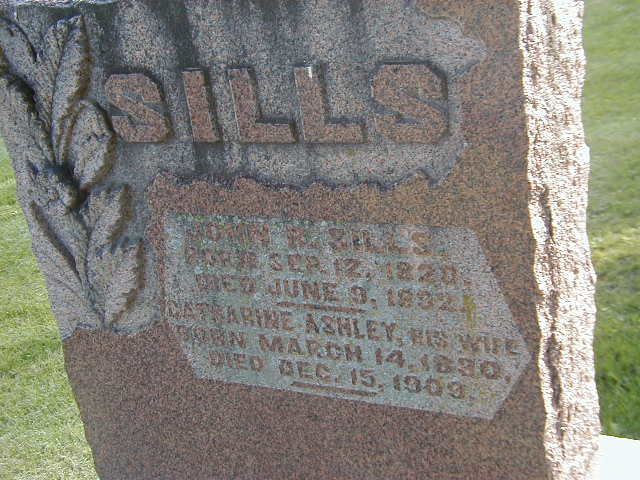 John R. Sills was born on 12 September 1828; Date Sep 12 1828 per Memorial. per Pioneer Life on the Bay of Quinte, pg. 97.1,2 He married Catharine Ashley, daughter of Simeon Ashley and Mary Nash, after 1848; per Pioneer Life on the Bay of Quinte, pg. 97.1 John R. Sills died on 9 June 1892 at Ontario at age 63; Date Jun 9 1892 per Memorial.2 He was buried on 11 June 1892 at Foxboro Cemetery, Thurlow Twp., Foxboro, Hastings Co., Ontario; Memorial: (See Exhibit) SILLS; John R. Sills; Born Sep 12 1828; Died Jun 9 1892; Catharine Ashley his wife; Born March 14 1830; Died Dec 15 1909 (Foxboro Cemetery, Foxboro, June 22, 2006.)2