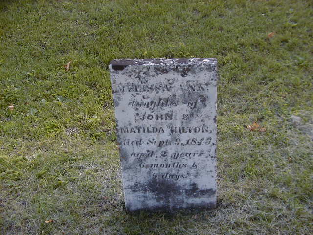 Melissa Ann Hilton was born on 2 March 1843 at Thurlow Twp., Hastings Co., Ontario; Date Mar 2 1843 per calc from Memorial - age 2y 6m 9d at death Sep 9 1845. Date Feb 28 1843 per IGI Record.1,2 She died on 9 September 1845 at Thurlow Twp., Hastings Co., Ontario, at age 2; Date Sep 9 1845 per Memorial. per IGI Record.1,2 She was buried on 11 September 1845 at Foxboro Cemetery, Foxboro, Hastings Co., Ontario; per IGI Record.1