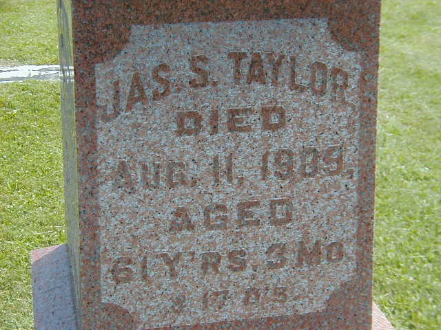 James Samuel Taylor was born on 24 April 1848 at Murray Twp., Northumberland Co., Canada West; Date Apr 24 1848 & location Ont. rural per 1901 Census. Date 1848 & location Ont. per 1881 Census. Date 1848 & location Ont. per 1891 Census. Date 1849 & location Ontario per 1871 Census. Date 1848 & location UC per 1861 Census. Date 1847 & location Cda. per 1851 Census. Date 1848 & location Brighton Twp. per marr. reg'n.1,3,2,4,5,6,7 He appeared on the census of 1852 at Murray Twp., Northumberland Co., Canada West; Age 4 at 1851 Census: see James Taylor (grandfather.)3 He appeared on the census of April 1861 at Brighton Twp., Northumberland Co., Canada West; Age 13 at 1861 Census: see William Taylor.4 He appeared on the census of April 1871 at Brighton Twp., Northumberland Co., Ontario; Age 22 at 1871 Census: see William Taylor.1 He lived on 25 March 1874 at Brighton Twp., Northumberland Co., Ontario; Residence Brighton Twp. per marr. reg'n.2 He married Henrietta J. McCartney, daughter of James McCartney and Eliza Taylor, on 25 March 1874 at Hillier Twp., Consecon, Prince Edward Co., Ontario; Marriage Reg'n.#008394: Groom: James S. Taylor; Age: 26; Res. & Born: Brighton Twp; Status: bachelor; Occ.: yeoman; Parents: William & Ann Taylor; Bride: Hennrietta McCartney; Age: 24; Res. & Born: Hillier; Status: spinster; Parents: James & Eliza McCartney; Wit.: T. G. Osborne & R. A. Flynn, Consecon; Date: Mar 25 1874; Place: Consecon; Rel.: WM; Performed by: Rev. William J. Hewitt; Reg'r.: Samuel Jones (Ontario Marriage Registration, #008394-1874, ancestry.com.)8 James Samuel Taylor lived on 3 April 1878 at Hillier Twp., Prince Edward Co., Ontario; Residence Hillier Twp. per marr. reg'n.2 He married Adeline Amanda Huycke, daughter of Platt Huycke and Hannah Osterhout, on 3 April 1878 at Hillier Twp., Wellington, Prince Edward Co; Marriage Reg'n.#009422: Groom: James Samuel Taylor; Age: 30; Res.: Hillier Twp; Born: Cda; Status: widower; Occ.: farmer; Parents: William & Ann Taylor; Bride: Adeline Huyck; Age: 27; Res.: Hillier Twp; born: Cda; Status: spinster; Parents: Platt & Hannah Huyck; Wit.: Martha S. Hanson, Wellington; Date: Apr 3 1878; Place: Wellington; Rel.: Meth; Performed by: Rev. Chas. A. Hanson; Reg'r.: John H. Osborne (Ontario Marriage Registration, #009422-1878, ancestry.com.)9 James Samuel Taylor appeared on the census of April 1881 at Hillier Twp., Prince Edward Co., Ontario; Age 33 at 1881 Census: Taylor, James S., 33, b. Ont., Cda., CM, farmer, married; Adaline, 31, b. Ont., Cda., Cm, married; McKay, William, 16, b. Scotland, Scot., CM, servant (familysearch.org.)7 He appeared on the census of April 1891 at Hillier Twp., Prince Edward Co., Ontario; Age 43 at 1891 Census: Taylor, James, 43, b. Ont., p.b. Ont., Meth., farmer, married; Adeline, 42, b. Ont., p.b. Ont., Meth., married (1891 Census Online: Hillier Twp., dist. 112, sub-dist. 17, pg. 13, line 22.)6 He lived on 4 February 1898 at Village Lot 33, Main St. South, Brighton, Northumberland Co., Ontario; Land Registry Records (Grant 3045) show that James S. Taylor, Theodore W. Taylor, Manford C. Taylor, Executors of the estate of the late William Taylor sold "said village lot" meaning Village Lot 33, Main St. South, Brighton Village, Northumberland Co. to Phila A. Blakely for $1,125. ITS Date: Feb 4 1898. Reg'n. Date: Feb 23 1898. (Ontario Land Registry Records, Northumberland Co., Brighton Village, Book 004, pg. 166 of 399, page copied from OnLand.ca by Dan Buchanan, Apr 6 2023.)10 He appeared on the census of April 1901 at Hillier Twp., Prince Edward Co., Ontario; Age 52 at 1901 Census: Taylor, James, 52, b. Ont. r. Apr 24 1848, Eng., Meth., Miller, married; Adeline, 50, b. Ont. r. May 26 1850, Eng., Meth., married (1901 Census Online: Hillier Twp., dist. 109, sub-dist. d-4, pg. 5, line 49, T-6493 - Conc 1, Lot 18.)5 He lived in April 1901 at Conc 1 Lot 18, Hillier Twp., Prince Edward Co., Ontario; Residence per 1901 Census: Conc 1, Lot 18, Hillier Twp.5 He died on 11 August 1909 at Hillier Twp., Prince Edward Co., Ontario, at age 61; Death Reg'n.#025200: Name: James S. Taylor; Date: Aug 11 1909; Age: 62; Res.: Hillier Twp; Status: married; Occ.: miller; Parents: William Taylor & Abigail Carscallen, b. Thurlow; Cause: heart disease; Phys.: Dr. J. J. Brad; Inf.: W. Taylor, Hilton; Reg'd.: Aug 12 1909; Reg'r.: Stephen Weese (Ontario Death Registration, #025200-1909, ancestry.com.)11