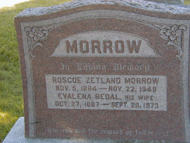 Roscoe Zetland Morrow was born on 5 November 1884 at Brighton Twp., Hilton, Northumberland Co., Ontario; Birth Reg'n.#023258: Name: Roscoe Zetland Morrow; Date: Nov 5 1884; Parents: R. O. Morrow & Alice Berton; Inf.: R. O. Morrow, farmer, Hilton; Reg'd.: Dec 31 1884; Reg'r.: C. Richmond (Ontario Birth Registration, #023258-1884, ancestry.com) Date Nov 5 1884 & location Ont. per Death Reg'n. Date 1884 & location Ont. per 1921 Census. Date Nov 5 1884 per Burial. Date Nov 5 1885 per 1901 Census.1,2,7,4,6 He appeared on the census of April 1901 at Brighton Twp., Northumberland Co., Ontario; Age 16 at 1901 Census: see Robert Orloff Morrow.1 He lived on 14 February 1905 at Brighton Twp., Hilton, Northumberland Co., Ontario; Witness at marriage of Clarence Thorne & Adaline Macklam.8 He lived on 3 March 1909 at Brighton Twp., Hilton, Northumberland Co., Ontario; Residence Hilton per marr. reg'n.8 He married Evalena Bedal, daughter of Willet Bedal and Harriet Felinda "Hattie" Davern, on 3 March 1909 at Brighton, Northumberland Co., Ontario; Marriage Reg'n.#015338: Groom: Roscoe Zetland Morrow; Age: 24; Res.: Hilton; Status: bachelor; Occ.: farmer; Rel.: Anglican; Parents: R. O. Morrow & Alice Burton; Bride: Alice Bedal; Age: 22; Res.: Brighton; Status: spinster; Occ.: milliner; Rel.: Meth; Parents: Willet Bedal & Hattie Davern; Wit.: Frank G. Harnden & Annie M. Morrow, Hilton; Date: Mar 3 1909; Reg'd.: Mar 3 1909; Performed by: Rev. L. S. Wright, Brighton; Reg'r.: G. C. Lockwood, Brighton (Ontario Marriage Registration, #015338-1909, ancestry.com.)9,10 Roscoe Zetland Morrow lived in June 1911 at Conc 4 Lot 3, Brighton Twp., Northumberland Co., Ontario; Residence per 1911 Census: Conc 4, Lot 3 & 4, Brighton Twp.9 He appeared on the census of June 1911 at Brighton Twp., Hilton, Northumberland Co., Ontario; Age 27 at 1911 Census: Morrow, Roscoe, 27, b.Ont. Nov 1884, Irish, Meth., farmer, married; Evelyn, 24, b. Oct 1867, Irish, Meth., married; Douglas, 7 months, b. Sept 1910, son (Conc 4, Lot 3 & 4) (1911 Census Image from Archives Canada Web site: Hilton, page 12, line &.9 He appeared on the census of 1921 at Brighton Twp., Northumberland Co., Ontario; Age 37 at 1921 Census: Morrow, Roscoe, 37, b. Ont., p.b. Ont., Eng., Meth., farmer, married; Evelina, 35, b. Ont., p.b. Ont., Eng., Meth., married; Douglas, 10; Evelina, 7; Armstrong, Eric, 22, b. England, p.b. England, immig. 1920, Eng., Meth., farm lab., single (1921 Census: Brighton Twp., Northumberland Co., dist. 107, sub-dist. 4, pg. 9, line 31 - ancestry.ca)