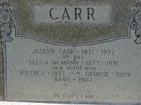 CemSearch: Name: Joseph CArr; Born: 1871; Died: 1951; ID: CHRCHU073: Other names: Carr, Basil (1904-1904), Carr, Ellen [McMann] (1877-1931), Carr, George (1899-1899), Carr, Wilfred (1897-1897); Cemetery: Christian Church Cemetery/Cramahe Hill Cemetery, Conc 9, Lot 14, Cramahe Twp., near Morganston, Northumberland Co., Row 8 Plot 9; Note: Husband of Ellen McMann