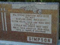 Luella Ida Cross was born in November 1882 at Murray Twp., Northumberland Co., Ontario; Date 1882 per Memorial. Date 1882 & location Ont. per 1921 Census. Date Nov 1881 & location Ont. per 1911 Census. Date 1881 & location Murray Twp. per marriage reg'n.1,2,3,4 She lived on 1 February 1905 at Trenton, Hastings Co., Ontario; Residence Trenton per marriage reg'n.3 As of 1 February 1905,her married name was Simpson. She married Elton Isaac "Etty" "Dido" Simpson, son of William Oscar Simpson and Alwilda L. Hare, on 1 February 1905 at Trenton, Hastings Co., Ontario; Marriage Reg'n.#010167: Groom: Elton Simpson; Age: 22; Res.: Trenton; Born: Brighton; Status: bachelor; Occ.: farmer; Parents: Oscar Simpson & not given; Bride: Luella Cross; Age: 23; Res.: Trenton; Born: Murray Twp; Status: spinster; Parents: John Cross & J. A. Brown... pg 2 n/a ... Date: Feb 1 1905; Place: Hastings Co. (Marriage Registration, #010167-1905, ancestry.com) per 1911 Census.1,5 Luella Ida Cross appeared on the census of June 1911 at Brighton Twp., Northumberland Co., Ontario; Age 28 at 1911 Census: see Oscar Simpson (father-in-law.)1 She appeared on the census of 3 June 1921 at Ward 3, Brighton, Northumberland Co., Ontario; Age 39 at 1921 Census: see Elton Simpson.4 She died in 1953 at Ontario; Date 1953 per Burial.2 She was buried in 1953 at Woods Cemetery, Cramahe Twp., Northumberland Co., Ontario; Memorial: (See Exhibit) Wm. Oscar Simpson 1852 - 1920; His wife; Alwilda Hare 1853 - 1937; Elton Isaac, Their Son 1882 - 1963; His Wife; Luella Ida Cross 1882 - 1953; Nola, Their Daughter 1906 - 1953; Wife of Donald Shannon; SIMPSON (Woods Cemetery, Cramahe Twp., July 3, 2004.)2