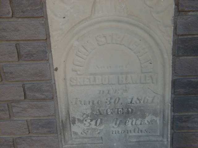 John Stachan Hawley was born on 6 December 1830 at Murray Twp., Northumberland Co., Upper Canada; Date Nov 1861 per Memorial - age 30y 7m at death June 30 1861. Date Dec 6 per GEDCOM of Lisa Stephens, Aug 31, 2005.1,2 He appeared on the census of 1851 at Murray Twp., Northumberland Co., Ontario; Age 22 at 1851 Census: see Sheldon Hawley.3 He died on 30 June 1861 at Murray Twp., Northumberland Co., Canada West, at age 30; Date June 30 1861 per Memorial. Date 1861 per GEDCOM of Lisa Stephens, Aug 31, 2005.2 He was buried on 2 July 1861 at St. George's Anglican Church Cemetery, Trenton, Hastings Co., Canada West; Memorial: (See Exhibit) John Strachan; Son of; Sheldon Hawley; Died; June 30, 1861; Aged; 30 Years; & 7 Months (St. George's Anglican Church Cemetery, Trenton, Sep 24 2005) per GEDCOM of Lisa Stephens, Aug 31, 2005.1,2
