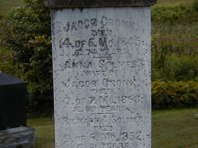 Jacob Cronk was born in 1771 at Poughkeepsie, Dutchess Co., New York, U.S.A; Date 1771 per Memorial - age 74y at death Jun 14 1845. per GEDCOM of Paul Enge, Sep 7, 2005.1,2 He married Anna Solmes before 1792 at Ontario; "In order to finance a trip to the United States to bring back his bride, young Jacob had to seel part of his land and spend the winter working in Adolphustown cutting cordwood for four dollars a month plus board. His trip was successful, however, and her name, Anna Cronk, can still be seen scratched in the glass of one of the windows of their house." from "Homesteads: buildings and families from Kingston to Toronto" by Margaret McBurney and Mary Byers, 1979, pg. 52