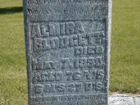 Almira Merriam was born on 12 October 1813 at Haldimand Twp., Northumberland Co., Upper Canada; Date Oct 10 1813 per Memorial - age 76y 6m 27d at death May 7 1890. Date Oct 12 1813 & location Haldimand per GEDCOM of Dennis B. von Ting, May 8, 2007. per GEDCOM of James A. McKane, Oct. 4, 2005.1,2 As of 1829,her married name was Richardson.1 She married Goldsmith Richardson, son of Thomas Richardson Jr. and Ruth Sutliff, in 1829 at Northumberland Co., Upper Canada; per GEDCOM of Dennis B. von Ting, May 8, 2007.1 As of 22 January 1837,her married name was Blodgett.1 Almira Merriam married Levi Turner Blodgett on 22 January 1837 at Haldimand Twp., Northumberland Co., Ontario; Marriage Register: Terry (Levi) Blodget, to Almira Richardson, both of Haldimand, 22 Jan 1837, Rev. Card. Wit.: Truman Card & John Packard (Marriage Registers of Upper Canada, Newcastle Dist., 1810-1848, Ontario Archives) per GEDCOM of Dennis B. von Ting, May 8, 2007.1,3 Almira Merriam appeared on the census of April 1871 at Haldimand Twp., Northumberland Co., Ontario; Age 57 at 1871 Census: see Levi Blodget.4 She died on 7 May 1890 at Haldimand Twp., Northumberland Co., Ontario, at age 76; Date May 7 1890 per Memorial.2 She was buried on 9 May 1890 at Academy Hill Cemetery, Haldimand Twp., Northumberland Co., Ontario; Memorial: (See Exhibit) Almira Blodgett; Died; May 7, 1890; Aged 76 Y's; 6 M's & 27 D's (Academy Hill Cemetery, Haldimand Twp., June 9, 2007.)2