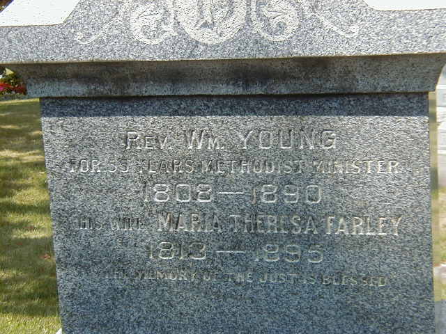 Maria Theresa Farley was born on 13 September 1812 at Hope Twp., Northumberland Co., Ontario; Date 1813 per Memorial. Date Sep 13 1812 & location Hope per GEDCOM of Lorne Tweed, Nov 6, 2005. Date 1814 & location Ont. per 1871 Census. Date 1813 & location UC per 1861 Census.1,3,4,2 As of 13 September 1842,her married name was Young.1 She married Rev. William Young, son of Stephen Young Sr. and Lucy Marsh, on 13 September 1842 at Ontario; per GEDCOM of Lorne Tweed, Nov 6, 2005.1 Maria Theresa Farley appeared on the census of April 1861 at Murray Twp., Northumberland Co., Ontario; Age 48 at 1861 Census: see William Young.3 She appeared on the census of April 1871 at Murray Twp., Northumberland Co., Ontario; Age 57 at 1871 Census: see Rev. William Young.4 She appeared on the census of April 1881 at Trenton, Hastings Co., Ontario; Age 67 at 1881 Census: see Rev. William Young.5 She died on 30 May 1895 at Trenton, Hastings Co., Ontario, at age 82; Date 1895 per Memorial. Date May 30 1895 per GEDCOM of Lorne Tweed, Nov 6, 2005.1,2 She was buried on 2 June 1895 at Mount Evergreen Cemetery, Trenton, Hastings Co., Ontario; Memorial: (See Exhibit) Rev. Wm. Young; 1808 - 1890; His Wife; Maria Theresa Farley; 1813 - 1895 (Mount Evergreen Cemetery, Trenton, Aug 28 2005.)2