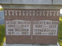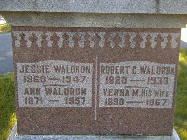 Jessie Waldron was born on 7 May 1870 at Murray Twp., Northumberland Co., Ontario; Date May 7 1870 per 1901 Census. Date May 1869 & location Ont. per 1911 Census. Date 1869 per 1881 Census.1,3,4 She appeared on the census of April 1871 at Murray Twp., Northumberland Co., Ontario; Age 2 at 1871 Census: see Robert Waldron.2 She appeared on the census of April 1881 at Murray Twp., Northumberland Co., Ontario; Age 12 at 1881 Census: see Robert Waldron.1 She appeared on the census of April 1901 at Sidney Twp., Northumberland Co., Ontario; Age 30 at 1901 Census: see Robert E. Waldron.3 She lived on 15 June 1910 at Trenton, Hastings Co., Ontario; Witness at marriage of sister Mary Elizabeth (Waldron) Weddell.5 She appeared on the census of 1911 at Sidney Twp., Hastings Co., Ontario; Age 42 at 1911 Census: see Robert C. Waldron (brother.)4 She died in 1947 at Ontario; Date 1947 per Burial.6 She was buried in 1947 at St. George's Cemetery, Trenton, Northumberland Co., Ontario; Memorial: (Exhibit) Jessie Waldron; 1869 - 1947; Ann Waldron; 1871 - 1957; Robert C. Waldron; 1880 - 1933; Verna M., His Wife; 1890 - 1967 (St. George's Cemetery, Trenton, Sep. 24, 2005.)6