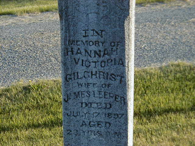 Hannah Victoria Gilchrist was born in October 1868 at Ontario; Date Oct 1868 per Burial. Date 1868 & locaiton Cda. per marr. reg'n.1,2 As of 15 December 1891,her married name was Leeper.1 She married James Leeper, son of Robert Leeper and Elizabeth Pearson, on 15 December 1891 at Northumberland Co., Ontario; Marriage Reg'n.#008561: Groom: James Leeper; Age: 33; Res.: Asphodel; Born: Cda; Status: bachelor; Occ.: farmer; Parents: Robert & Eliza Leeper; Bride: Hannah Gilchrist; Age: 23; Res.: Percy Twp; Born: Cda; Parents: Thomas Gilchrist & Maitha Speers; Wit.: Thomas King, Asphodel & Jeannie Gilchrist, Percy; Date: Dec 15 1891; Rel.: Pres; Performed by: D. A. Thomas (Ontario Marriage Registration, #008561-1891, ancestry.com) Date Dec 15 1891 & location Northumberland per family tree of terryadams86 on ancestry.com, Aug 9 2014. per burial.1,3,4 Hannah Victoria Gilchrist died on 7 July 1897 at Ontario at age 28; Date Jul 7 1897 per Burial.1 She was buried on 9 July 1897 at Norwood-Asphodel Cemetery, Norwood, Peterborough Co., Ontario; Memorial: (See Exhibit) In; Memory of; Hannah; Victoria; Gilchrist; Wife of; James Leeper; Died; July 7, 1897; Aged; 28 Y'rs, 8 M (Norwood-Asphodel Cemetery, Norwood, June 3, 2005.)1