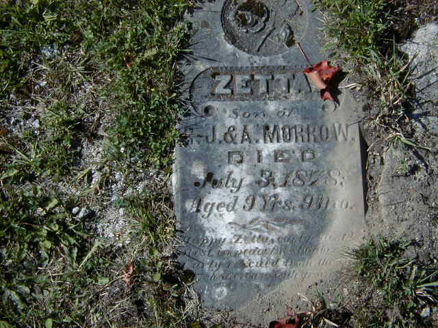 Zetta Morrow was born in October 1868 at Brighton Twp., Northumberland Co., Ontario; Date Oct 1868 per Burial. Date 1869 & location Ont. per 1871 Census.1,2 He appeared on the census of April 1871 at Brighton Twp., Northumberland Co., Ontario; Age 2 at 1871 Census: see Robert J. Morrow.2 He died on 3 July 1878 at Brighton Twp., Northumberland Co., Ontario, at age 9; Date Jul 3 1878 per Burial.1 He was buried on 5 July 1878 at Hilton Cemetery, Brighton Twp., Hilton, Northumberland Co., Ontario; Memorial: (See Exhibit) Zetta; Son of; R J & A Morrow; Died; July 3, 1878; Aged 9 yrs & 9 mos (Hilton Cemetery, Sep 24, 2004.)1