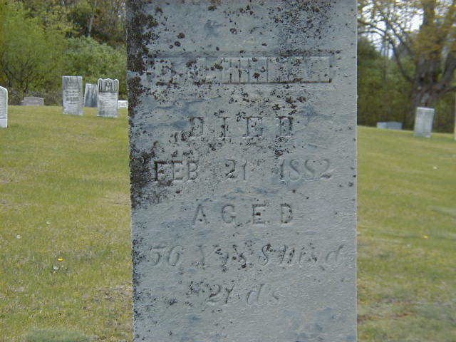Derrick Jay Hinman was born on 25 May 1825 at Haldimand Twp., Northumberland Co., Ontario; Date May 25 1825 per Burial. Date 1827 per 1881 Census.1,2 He married Menerva Ann Spencer before 1859 at Northumberland Co., Ontario; per 1881 Census.2 Derrick Jay Hinman appeared on the census of April 1881 at Haldimand Twp., Northumberland Co., Ontario; Age 54 at 1881 Census: Hinman, Derrick Jay, 54, b. Ontario, Eng., Bapt., Cosntable, married; Menerva Ann, 42, b. Ont., Ger., Bapt., married; Esther, 21, b. Ont., Eng. (familysearch.org.)2 He died on 21 February 1882 at Haldimand Twp., Northumberland Co., Ontario, at age 56; Date Feb 21 1882 per Burial.1 He was buried on 23 February 1882 at Fairview Cemetery, Haldimand Twp., Grafton, Northumberland Co., Ontario; Memorial: (See Exhibit) D. J. Hinman; Died; Feb 21 1882; Aged; 56 Yr's 8 mo's & ; 21 D'ys (Fairview Cemetery, Grafton, May 23, 2005.)1