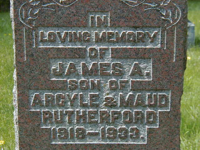 James A. Rutherford was born in 1918 at Cramahe Twp., Northumberland Co., Ontario; Date 1918 per Burial.1 He was buried in 1933 at Union Cemetery, Colborne, Northumberland Co., Ontario; Memorial: (See Exhibit) In; Loving Memory; Of; James A; son of; Argyle & Maud; Rutherford; 1918 - 1933 (Union Cemetery, Colborne, May 23, 2005.)1 He died in 1933 at Cramahe Twp., Northumberland Co., Ontario; Date 1933 per Burial.1
