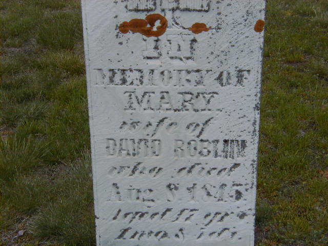 Mary Rowe was born on 3 July 1798; Date July 3 1798 per calc. re Burial. per IGI Record.1,2 As of before 1817,her married name was Roblin.1 She married David Roblin, son of John Philip Roblin and Elizabeth Esther Miller, before 1817 at Ontario; per IGI Record.1 Mary Rowe died on 8 August 1845 at Sidney Twp., Hastings Co., Ontario, at age 47; Date Aug 8 1845 per Burial.2 She was buried on 10 August 1845 at White's Cemetery, Sidney Twp., Trenton, Hastings Co., Ontario; Memorial: (See Exhibit) In; Memory of; Mary; Wife of; David Roblin; Who Died; Aug 8, 1845; Aged 47 yrs; 1 Mos. & 5 Dys (White's Cemetery, Trenton, May 22, 2005.)2