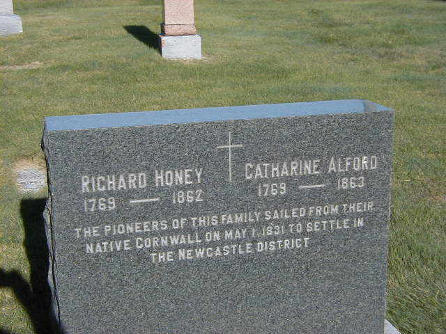 Note: Not sure this is the father of Charles but it matches time and place.1 He married Catharine Alford on 30 November 1796 at Lanteglos by Fowey, Cornwall, England; Date Nov 30 1796 & location Lanteglos by Fowey, Cornwall, England per family tree of olifroe on ancestry.ca, Nov 24 2022. per Burial.2 Richard Honey lived on 1 May 1831 at Northumberland Co., Ontario; Memorial: (See Exhibit) Richard Honey; 1769 - 1862; Catharine Alford; 1769 - 1863; The Pioneers of this family sailed from their native Cornwall on May 1, 1831 to Settle in the Newcastle District (Welcome Cemetery, Port Hope, Sep 26, 2004.)1 He died in 1862 at Durham Co., Ontario; Date 1862 per Burial.1 He was buried in 1862 at Welcome Cemetery, Port Hope, Northumberland Co., Ontario; Memorial: (See Exhibit) Richard Honey; 1769 - 1862; Catharine Alford; 1769 - 1863; The Pioneers of this family sailed from their native Cornwall on May 1, 1831 to Settle in the Newcastle District (Welcome Cemetery, Port Hope, Sep 26, 2004.)1