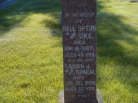 Sarah J. Rinch was born in 1837; Date 1837 per Burial.1 As of circa 1865,her married name was Oke.1 She married Paul Upton Oke, son of Thomas Baker Oke and Susannah Honey, circa 1865 at Ontario; per Burial.1 Sarah J. Rinch died on 20 January 1899 at Ontario; Date Jan 20 1899 per Burial.1 She was buried on 22 January 1899 at Welcome Cemetery, Port Hope, Northumberland Co., Ontario; Memorial: (See Exhibit) In Memory; Of; Paul Upton; Oke; Died; June 14, 1887; Aged 49 yrs; Also His Wife; Sarah J; Rinch; Died; Jan 20, 1899; Aged 62 Years; At Rest (Welcome Cemetery, Port Hope, Sep 26 2004.)1
