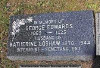 per email from Stephen Shirk, Dec. 13, 2005.1,4 George Edwards lived circa 1893 at Lewisham, Simcoe Co., Ontario; "Catherine and George Edwards settled in Lewisham, Ontario." per email from Stephen Shirk, Dec 12, 2005.1 He appeared on the census of 1921 at Conc A Lot 131, Foley Twp., Parry Sound Dist., Ontario; Age 53 at 1921 Census: Edwards, George, 53, b. Ont., p.b. Ont., Eng., Meth., lab. - CN, married; Katherine, 48, b. Ont., p.b. Ont., Eng., Meth., married; Sarah, 21, b. Ont., p.b. Ont., Eng., Meth., daughter, single; Peark, 7, daughter (1921 Census: Foley Twp., Parry Sound Dist., dist. 114, sub-dist. 12, pg. 5, line 18 - Conc A, pg. Lot 131 - ancestry.ca.)3 He died on 16 November 1926 at Conc B Lot 133, Foley Twp., Parry Sound Dist., Ontario, at age 58; Death Reg'n.#026637: Name: George Edwards; Date: Nov 16 1926; Age: 57; Res.: Lot 133, Conc B, Foley Twp., Parry Sound Dist., 9 yrs; Status: married; Occ.: lab., farming; Parents: ? - b. England & ? ; Phys.: M. H. Linbert MD, Parry Sound; Inf.: John Piers, ?Falding? Ont., son-in-law; Burial: Foley Cemetery, Foley Twp., Nov 19 1926; Und.: Alex Logan, Parry Sound; Casue: bullet wound in the head - suicide; Reg'd.: Nov 18 1926; Reg'r.: Margaret A. Henderson, Otter Lake Station (Ontario Death Registration, #026637-1926, ancestry.ca) Date Nov 26 or 27 1926 per email from Stephen Shirk, Dec. 13, 2005.1,5 He was buried on 19 November 1926 at Foley Cemetery, Foley Twp., Parry Sound Dist., Ontario; Memorial: (See Exhibit) In Memory of; George Edwards; 1869 - 1926; Husband of; Katherine Loshaw 1870-1944; Interment - Penetang, Ont. (Foley Cemetery, Foley Twp., Parry Sound Dist., image sent to me by Deb, May 29 2017) per Death Reg'n.2,6,1