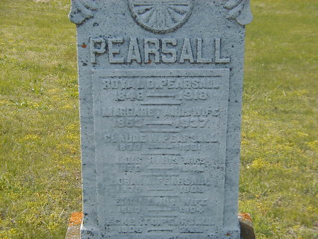 Claude W. Pearsall was born in September 1873 at Ameliasburg Twp., Prince Edward Co., Ontario; Date Sep 1873? per 1911 Census. Date 1878? per Burial. Date 1872 per 1881 Census. per GEDCOM of Doug Norman, Jan 3, 2006.1,2,4,3 He appeared on the census of April 1881 at Hillier Twp., Prince Edward Co., Ontario; Age 9 at 1881 Census: see Royal O. Pearsall.3 He married Lois H. ? before 1904 at Ontario.4 Claude W. Pearsall appeared on the census of 1911 at Ameliasburg Twp., Prince Edward Co., Ontario; Age 37 at 1911 Census: Pearsall, Claude, 37, b. Ont. Sep 1873?, French, Meth., farm lab., married; Lois H., 31, b. Ont. July 1877, German, Meth., married; Eckert O., 5, b. Ont. Feb 1905, son (1911 Census Online, ancestry.com: Ameliasburg Twp., dist. 115, sub-dist 1, pg. 6, line 30 - Lot 11, Carrying Place.)4 He lived on 1 August 1927 at Wellington, Prince Edward Co., Ontario; Informant for Death Reg'n. of his aunt Rebecca Ellenor (Pearsall) Jenkins.5 He was buried in 1931 at Carrying Place Cemetery, Murray Twp., Carrying Place, Northumberland Co., Ontario; Memorial: (See Exhibit) PEARSALL; Royal O. Pearsall; 1846 - 1918; Margaret A. His Wife; 1853 - 1957; Cladue W. Pearsall; 1878? - 1931?; Lorne? A. Pearsall; 1876 - 1908; Emma? L. His Wife; Eckert? O. Pearsall; 1908 - (Carrying Place Cemetery, June 10, 2006.)2 He died in 1931 at Ontario; Date 1931??? per Burial.2