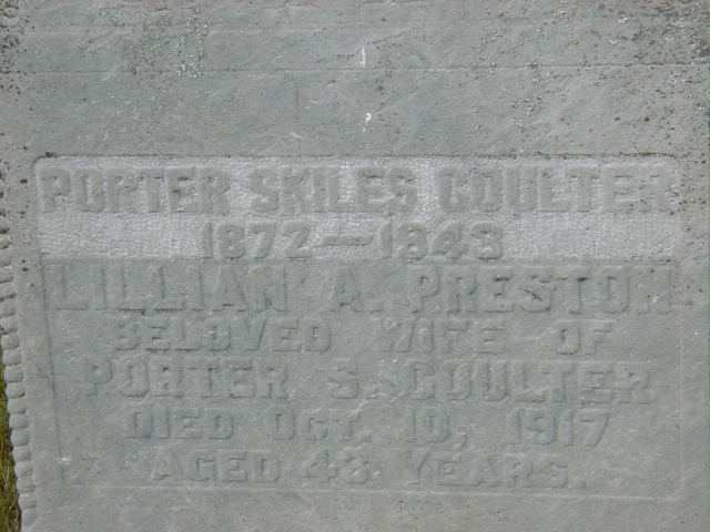 Porter Skiles Coulter was born on 1 November 1872 at Brighton Twp., Northumberland Co., Ontario; Date 1872 per Memorial. Date Nov 1 1872 & location Ont. per Death Reg'n. Date 1873 & location Ont. per 1891 Census. Date 1873 & location Ont. per 1881 Census. Date Nov 1 1872 & location Brigton per family tree of rburgesslinn on ancestry.ca, Dec 18 2021.1,5,6,2,4 He appeared on the census of April 1881 at Brighton Twp., Northumberland Co., Ontario; Age 8 at 1881 Census: see Aaron Coulter.1 He appeared on the census of April 1891 at Brighton Twp., Northumberland Co., Ontario; Age 18 at 1891 Census: see Aaron P. Coutler.5 He married Lillian Ann Preston, daughter of Thomas Preston and Jane Thompson, on 17 June 1896 at Trenton, Hastings Co., Ontario; per family tree of rburgesslinn on ancestry.ca, Dec 18 2021.6 Porter Skiles Coulter died on 9 February 1943 at Murray Twp., Northumberland Co., Ontario, at age 70; Death Reg'n.#028216: Name: Porter Skiles Coulter; Date: Feb 9 1943; Age: 70y 3m 9d; Res.: Murray Twp., 25y; Born: Ont. Nov 1 1872; Nat.: Irish; Status; married; Occ.: farmer; Parents: Aaron Coulter, b. Ont. & Abigail Lockland, b. Ont; Inf.: Harold Coulter, 428 Landsown Ave., Toronto, son; Burial: Smithfield, Feb 12 1943; Permit: Wm. J. Potts, Trenton; Und.: N. J. McNair; Cause: myocarditis, arterio schlerosis, chronic rheumatism; Phy.: H.F. Clark?, Brighton; Reg'd.: Mar 10 1943; Reg'r.: David Teal (Ontario Death Registration, #028216-1943, ancestry.ca) Date 1943 per Memorial. per family tree of rburgesslinn on ancestry.ca, Dec 18 2021.6,7,4 He was buried on 12 February 1943 at Greenwood Cemetery, Brighton Twp., Smithfield, Northumberland Co., Ontario; Memorial: (see Exhibit) Porter Skiles Coulter; 1872 - 1943; Lillian A. Preston; Beloved Wife of; Porter S. Coulter; Died Oct. 10, 1917; Aged 43 Years (Greenwood Cemetery, Smithfield, by Dan July 9 2004) Date Feb 12 1943 & location Smithfield per Death Reg'n.2,4