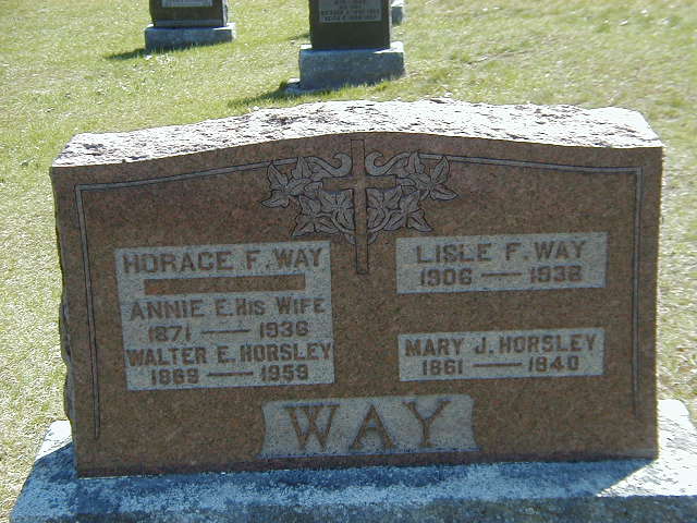 Memorial: (See Exhibit) Horace F. Way; -- ; Annie E. His Wife; 1871 - 1936; Walter E. Horsley; 1869 - 1959; Lisle F. Way; 1906 - 1936; Mary J. Horsley 1861 - 1940; WAY (Codrington Roman Catholic Cemetery, Brighton Twp., Oct 29 2010, by Dan)