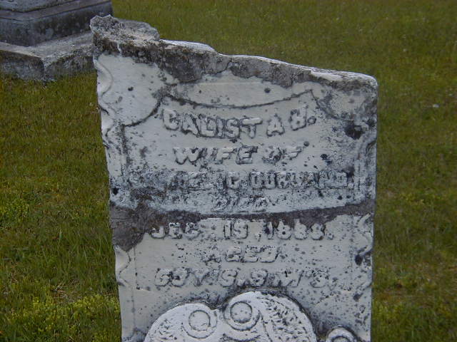 Calista Helen Lott was born on 8 April 1835 at Hastings Co., Ontario; Date Apr 8 1835 & location Hastings Co. per Death Reg'n. per marriage reg'n. of daughter Mary Elizabeth (Dorland) Anderson. per GEDCOM of Michael Miller, Jan 13, 2006.1,3 As of before 1858,her married name was Dorland.2 She married Samuel Casey Dorland, son of Daniel C. Dorland and Phoebe ?, before 1858 at Ontario; per marriage reg'n. of daughter Mary Elizabeth (Dorland) Anderson.2 Calista Helen Lott died on 19 December 1888 at Murray Twp., Northumberland Co., Ontario, at age 53; Death Reg'n.#012516: Name: Calista Dorland; Date: Dec 19 1888; Age: 53y 8m 11d; Res.: Murray; Born: Hastings Co; Status: wife of farmer; Inf.: T. Bell, Hastings; Cause: paralysis; Phys.: Dr. Rockwell; Rel.: Meth; Reg'd.: Dec 20 1888; Reg'r.: T. R. Garratt (Ontario Death Registration, #012516-1888, ancestry.com.)4 She was buried on 21 December 1888 at Stockdale Cemetery, Murray Twp., Stockdale, Northumberland Co., Ontario; Memorial: (See Exhibit) Calista H; Wife of Samuel C. Dorland; Died; Dec 19 1888; Age: 53 Yrs. 8 M's; ?? (Stockdale Cemetery, Stockdale, May 26, 2006.)5