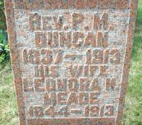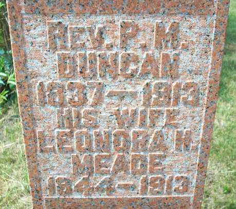 CemSearch: Name: Rev. Peter McLaren Duncan; Born: Oct 20 1836; Died: Apr 23 1913; ID: LAKEPT062; Other names: Duncan, Leonora Helen [Meade] (1844-1933), MacDonald, Alice McLaren [Duncan] (1879-1959), MacDonald, Ernest Duncan (1876-1966); Cemetery: Lakeport Cemetery, Conc B, Lot 1, Haldimand Twp., Village of Lakeport, Northumberland Co; Note: Rev. Peter Duncan, husband of Lenora Helen ? (https://www.cemsearch.ca/burial/?pid=LAKEPT062%5E0.)10,11