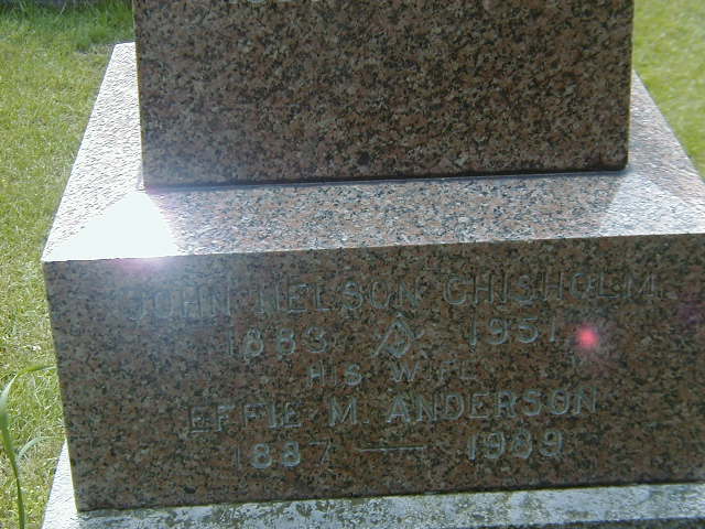 John Nelson Chisholm was born on 8 May 1883 at Sidney Twp., Hastings Co., Ontario; Date 1883 per Memorial & CEMSearch. Date May 8 1883 per 1901 Census. Date May 1883 per 1911 Census. per Death Reg'n. of his father, Charles Fraser Chisholm. Date 1883 per Burial. Location Prince Edward Co. per marriage reg'n.???1,3,2,4,5,6 He lived in 1890 at R.F.D. #2, Belleville, Hastings Co., Ontario; Per his marriage registration, John Nelson Chisholm, lived at R.F.D. #2, Belleville for 23 years at his marriage in 1913.5 He appeared on the census of April 1891 at Sidney Twp., Hastings Co., Ontario; Age 8 at 1891 Census: see Charles Chisholm.7 He appeared on the census of April 1901 at Sidney Twp., Hastings Co., Ontario; Age 17 at 1901 Census: see Charles Fraser Chisholm.3 He appeared on the census of 3 June 1911 at Sidney Twp., Wallbridge, Hastings Co., Ontario; Age 28 at 1911 Census: see Charles F. Chisholm.4 He married Effie May Anderson, daughter of Justice Melville Anderson and Mary Elizabeth Dorland, on 11 June 1913 at Sidney Twp., Hastings Co., Ontario; Marriage Reg'n.#005920-1913: Groom: John Nelson Chisholm; Age: 30; Res.: R.F.D. #2, Belleville - 23 years; Born: Prince Edward Co; Status: bachelor; Occ.: farmer; Rel.: Meth; Parents: Charles Chisholm & Martha Sills; Bride: Effie May Anderson; Age: 25; Res.: Frankford; Born: Sidney; Status: spinster; Rel.: Meth; Parents: J. Melville Anderson & Mary E. Sills; Wit.: W.. Sills, Halloway & Mabel Little, Trenton; Date: Jun 11 1913; Location: Sidney; Performed by: Jas. Batstone, Frankford, Meth. (Ontario Archives, MS932, Reel 255.)8 John Nelson Chisholm lived on 3 November 1920 at R. R. # 2, Beleville, Hastings Co., Ontario; Informant for Death Reg'n. of his father, Charles Fraser Chisholm.1 He died in 1951 at Ontario; Date 1951 per Memorial & CEMSearch.2,6 He was buried in 1951 at Belleville Cemetery, Belleville, Hastings Co., Ontario; Memorial: (See Exhibit) John Nelson Chisholm; 1883 - 1951; His Wife; Effie M. Anderson; 1887 - 1989 (Belleville Cemetery, Belleville, June 22, 2006)