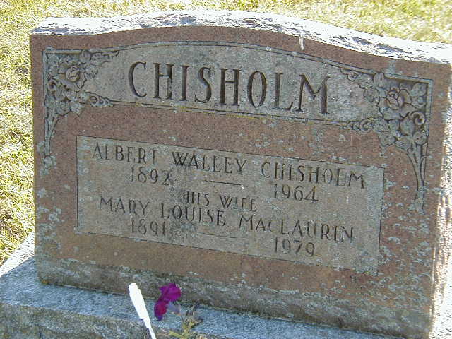 Albert Walley Chisholm was born on 13 August 1892 at Regina, Saskatchewan; Date Aug 13 1892 & location NWT per 1901 Census. Date 1893 & location Regina per Death Notice.1 He appeared on the census of April 1901 at Prince Albert, Saskatchewan; Age 8 at 1901 Census: see William H. Chisholm.1 He married Mary Louise MacLaurin before 1945; per marriage notice of daughter Katherine Louise Chisholm. Albert Walley Chisholm lived on 11 February 1952 at Colborne, Northumberland Co., Ontario; " .. of Colborne .." per marriage of son Ryan. He died on 12 March 1964 at Cobourg District Hospital, Cobourg, Northumberland Co., Ontario, at age 71; "Obiturary: Albert Chisholm - Rev. F. w. French of Colborne United Church officiated at the funeral service March 14 for Albert Walley Chisholm, who died at Cobourg District Hospital, March 12 after a six month illness. He was 71. Mr. Chisholm, born in Regina, had lived in Colborne where he undertook a mill business. son of the late W. H. Chisholm, Mr. Chisholm was educated in Regina and went to McMaster University. He was an elder in the United Church and familiar in lawn bowling and curling circles. From 1916 to 1919 Mr. Chisholm served in Engand with the Fifth Regiment. The body rested at Blacklock Funeral Home in Grafton and interment was at Salem Cemetery. Pall bearers were A. J. Dance, Malcolm Campbell, Harold Harnden, W. Shepard, T. McDonald and E. Jeffery." from The Trentonian, Friday, March 20, 1964, pg. 12, seen on microfilm at The Trenton Public Library, Feb 1, 2006. He was buried on 14 March 1964 at Salem Cemetery, Cramahe Twp., Salem, Northumberland Co., Ontario; Mermorial: (See Exhibit) CHISHOLM; Albert Walley Chisholm; 1892 - 1964; His Wife; Mary Louise MacLaurin; 1891 - 1979 (Salem Cemetery, July 10, 2004)