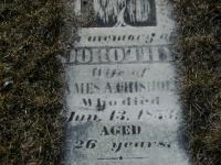 Dorothy ? was born in 1827 at Ontario; Date 1827 per Burial. Date 1825 & location Cda. per 1851 Census.1,2 As of circa 1844,her married name was Chisholm.1 She married James Allan Chisholm, son of Angus Allan Chisholm and Ann ?, circa 1844 at Northumberland Co., Canada West; per 1851 Census.1 Dorothy ? appeared on the census of 1851 at Brighton Twp., Northumberland Co., Ontario; Age 26 at 1851 Census: see James Chisholm.1 She died on 13 January 1853 at Cramahe Twp., Northumberland Co., Ontario; Date Jan 13 1853 per Burial. James Chisholm 2nd marriage in 1863.2 She was buried on 15 January 1853 at Woods Cemetery, Cramahe Twp., Northumberland Co., Ontario; Memorial: (See Exhibit) In Memory of; Dorothy; Wife of; James A. Chisholm; Who Died; Jan 13, 1853; Aged; 26 Years (Woods Cemetery, Cramahe Twp., Apr 2 2006.)2
