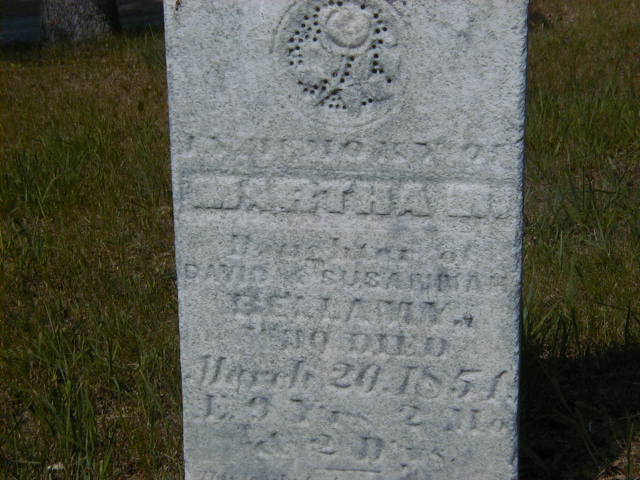 CEMSearch: Name: Martha M. Bellamy; Born: - ; Died: 1851-03-20; Age: 9y 2m 2d; Notes: Daughter of David & Susannah Bellamy; Buried: Castleton Cemetery, Sec 135; No other names.1,2