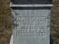 CEMSearch: Name: Alice Jennie Bellamy; Maiden: ? ; Born: 1856; Died: 1933; Notes: W/O Jerrie S. Bellamy B. A; Buried: Salem Cemetery, Sec NE; Other name: Jerrie S. Bellamy ( -1887.)1,2 She died in 1933; Date 1933 per Burial.1
