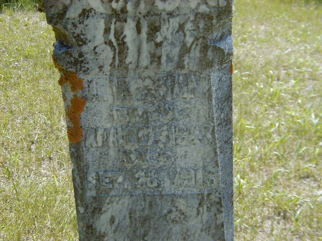 James Wright Ham was born on 17 April 1843 at Canada West; Date Apr 17 1843 per Memorial. Date 1843 & location Ont. per 1891 Census. Date 1844 & location Ont. per 1881 Census. Date 1844 & location Ont. per 1871 Census. Date 1843 & location Cda. per 1861 Census. Date Apr 17 1843 per Kemp GEDCOM sent to me via email by Cheryl Taber, March 14, 2006.1,6,2,3,4,5 He appeared on the census of April 1861 at Rawdon Twp., Hastings Co., Canada West; Age 18 at 1861 Census: see William Ham.2 He appeared on the census of April 1871 at Wollaston Limerick Cashel Twp.'s, North Hastings Co., Ontario; Age 27 at 1871 Census: see Mary Ham (mother.)4 He married Mary Jane Parr before 1873 at Ontario; per Kemp GEDCOM sent to me via email by Cheryl Taber, March 14, 2006.1 James Wright Ham appeared on the census of April 1881 at Limerick & Cashel Twp.'s, North Hastings Co., Ontario; Age 37 at 1881 Census: Ham, James, 37, b. Ont., Ger., CM, farmer, married; Mary, 28, b. Ont., French, CM, married; William, 7; Thomas A., 6; Alice, 5; Alfred, 3 (1881 Census: Limerick & Cashel Twp.'s, North Hastings Co., dist. 22, sub-dist. o, pg. 14, line 14 - ancestry.ca)(Thomas Ham is above.)3 He appeared on the census of 22 April 1891 at Limerick Twp., North Hastings Co., Ontario; Age 48 at 1891 Census: Ham. James W., 48, b. Ont., p.b. Ont., Meth., farmer, married; Mary, 38, b. Ont., p.b. Quebec & Ont., Meth., married; William, 17, b. Ont., p.b. Ont., Meth; Thomas, 16; Alfred, 13; Eleda(f), 4 (1891 Census: Limerick Twp., North Hastings Co., dist. 74, sub-dist. g-1, pg. 1, line 1 - ancestry.ca.)5 He died on 26 September 1913 at Rawdon Twp., Hastings Co., Ontario, at age 70; Date Sep 26 1913 per Memorial. Date Sep 26 1913 per Kemp GEDCOM sent to me via email by Cheryl Taber, March 14, 2006.1,6 He was buried on 28 September 1913 at St. Ola Cemetery, Limerick Twp., Hastings Co., Ontario; Memorial: (See Exhibit) James Ham; Born: Apr 17 1843; Died; Sep 26 1913 (St. Ola Cemetery, Limerick Twp., June 23, 2006.)6
